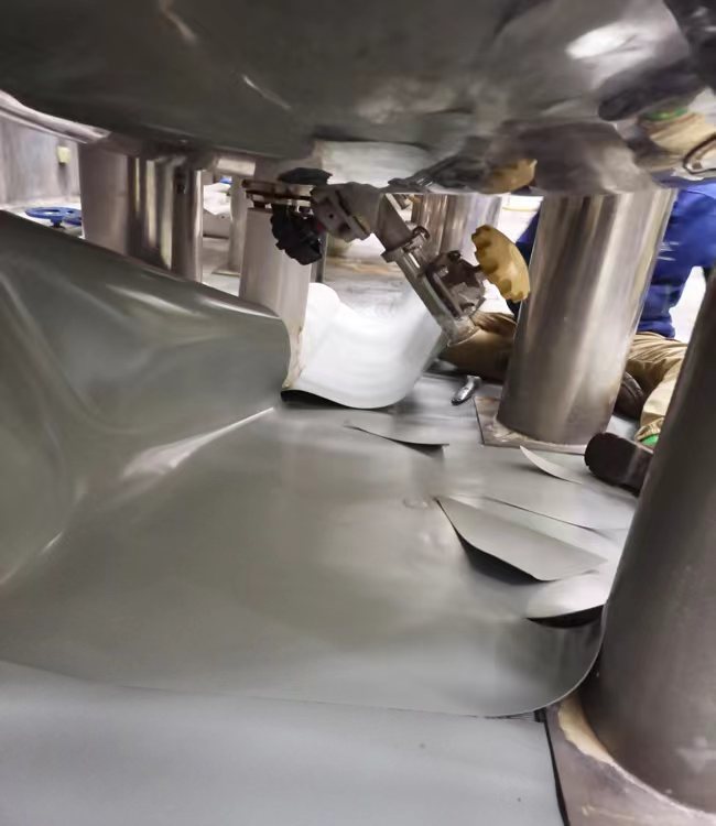 原车间地面为环氧地坪漆,存在鼓包,破损,开裂,脱层等问题。做其他地面需要打磨,灰尘很大,不适合用在此场所。再加上原有设备器械无法拆除,施工难度更上一层楼。